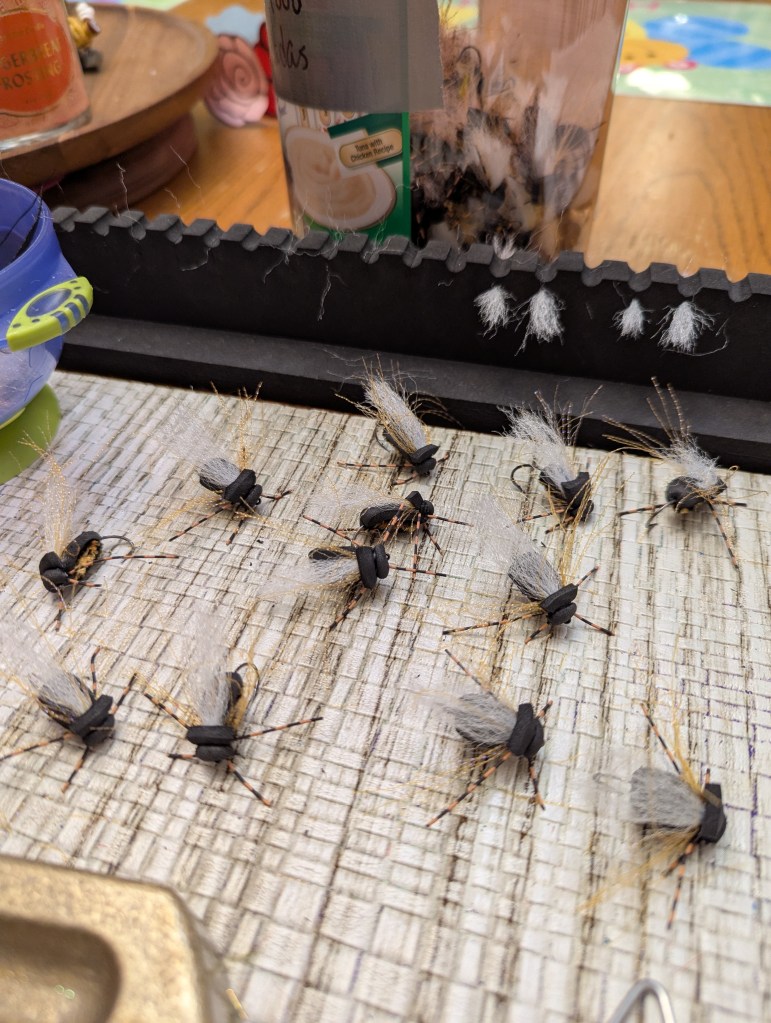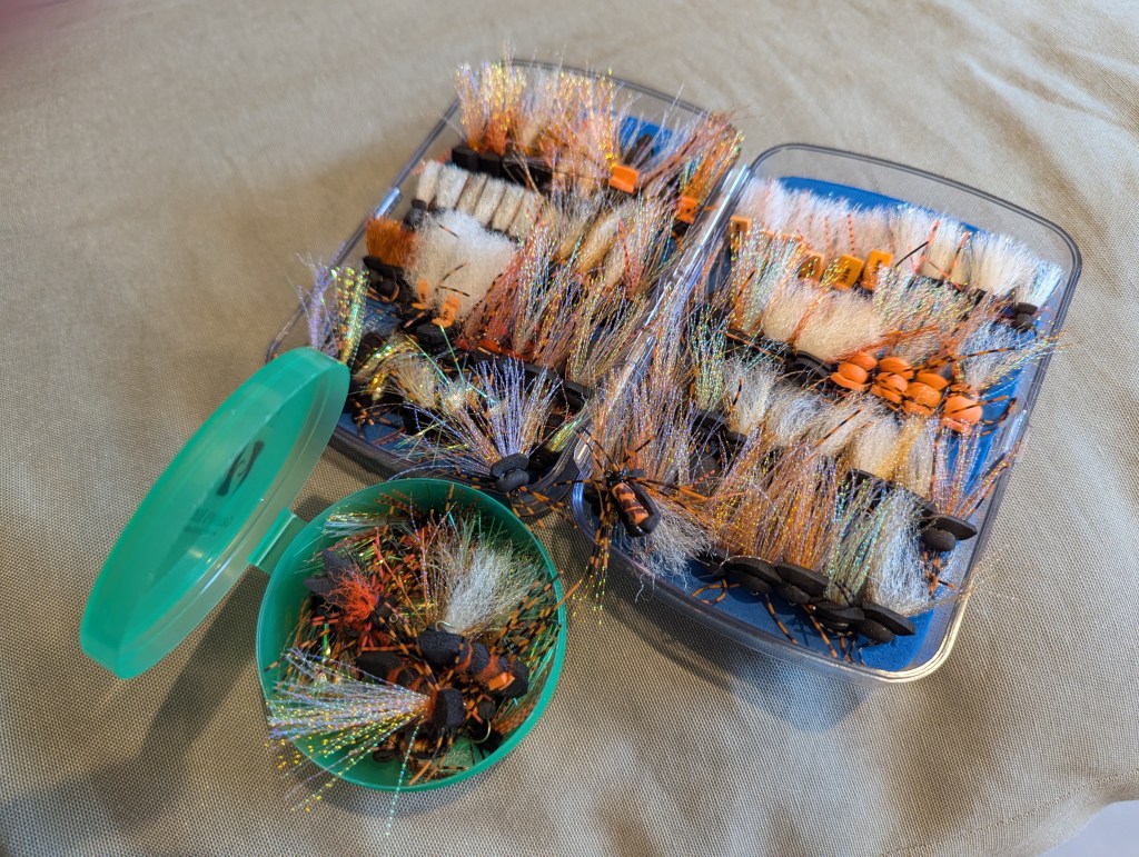 In our personal boxes we have a number of different floating cicada patterns, along with some different sunken patterns. Hook sizes that we’ve been using are 6-8, with wings made of either krystal flash, EP fibers, or a blend of the two. For the sunken patterns, wings are krystal flash and flashabou. Pattern styles are some Hoov’s cicadas (and variations with chenille, dubbing, or wrapped foam for the body), Fat Alberts, and some in the Mr. Wiggly style. Commercially tied patterns that we like are the MFC Card’s Cicada, MFC Cook’s Cicada, and Rio’s Flat Head Cicada. Blane Chocklett has a realistic cicada pattern that looks great, too.